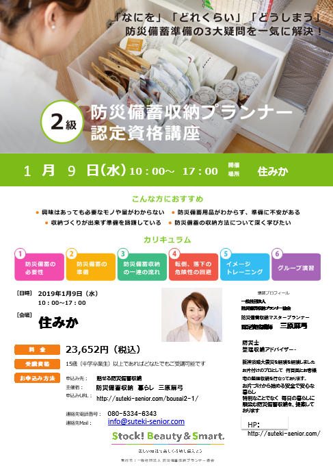 直近ですがリクエスト開催として急遽、大阪で防災備蓄収納2級プランナー認定講座開催します 2019年新春 防災備蓄収納を学びませんか? 1日1回の受講で 一般社団法人 防災備蓄収納プランナー協会から 防災備蓄収納2級プランナーの資格が取得できます &nbs... -
